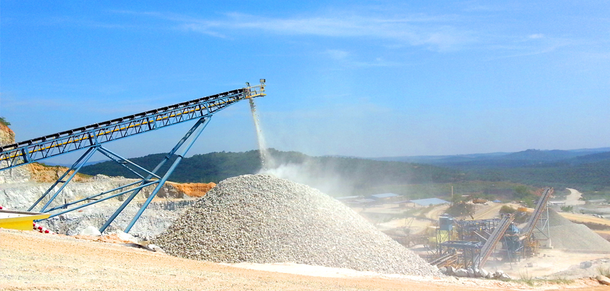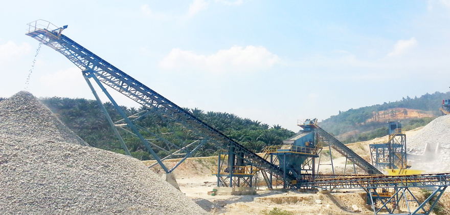 時(shí)產(chǎn)300-400噸石灰石(白云巖)類巖石的砂石骨料生產(chǎn)線,將經(jīng)過爆破處理或開挖洞采小于1160mm的毛料通過棒條給料機(jī)均勻的供給顎式破碎機(jī)破碎,經(jīng)顎式破碎機(jī)破碎后的半成品物料75-275mm,通過皮帶機(jī)輸送給反擊式破碎機(jī)進(jìn)行二次破碎,經(jīng)反擊破二次破碎后的混合骨料經(jīng)過皮帶機(jī)輸送至后續(xù)一篩車間進(jìn)行分級篩分,篩分過后將大于用戶需要的大顆粒物料再通過皮帶機(jī)重新返回反擊式破碎機(jī)循環(huán)破碎,篩分過后滿足客戶需要的不同顆粒級別的成品通過出料皮帶機(jī)輸送至成品料倉。如果成品砂需要水洗也可以配置洗砂機(jī)用于成品砂的水洗。