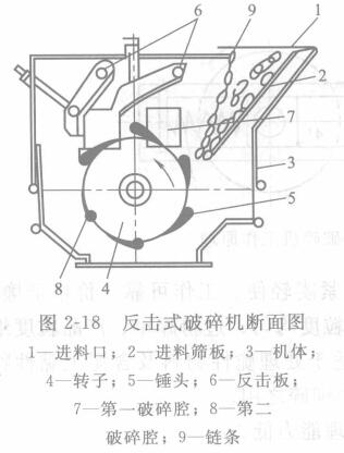反擊式破碎機是一種高效的新型破碎設備。圖2-18為反擊式破碎機的斷面圖。