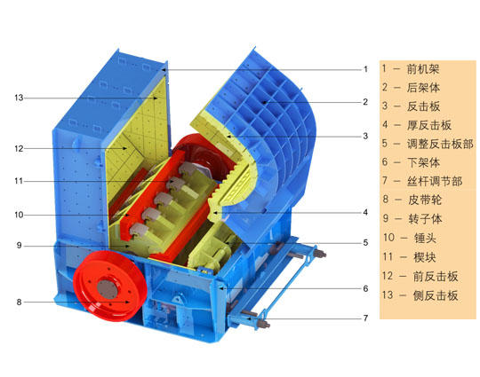 3、采用有鍵錐套聯(lián)接的轉(zhuǎn)子體、插入安裝的高效耐磨板錘、獨(dú)特的齒形反擊襯板、多方位開門機(jī)架、絲桿或液壓開啟裝置等,使設(shè)備更換易損件、檢修更加方便。